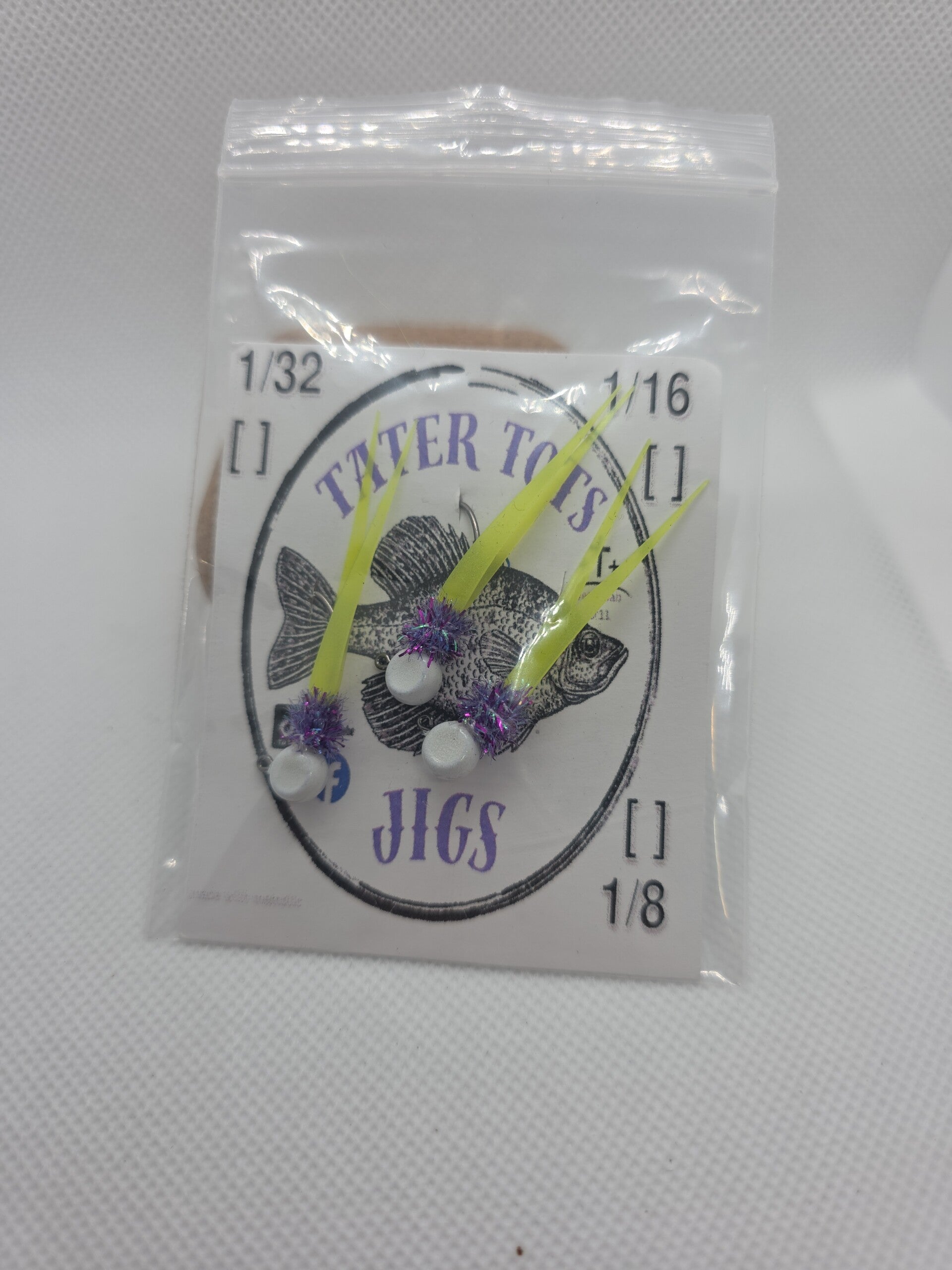 3 PAC of White freestyle split tail jig with purple ice cheenile and yellow Chartreuse split tails