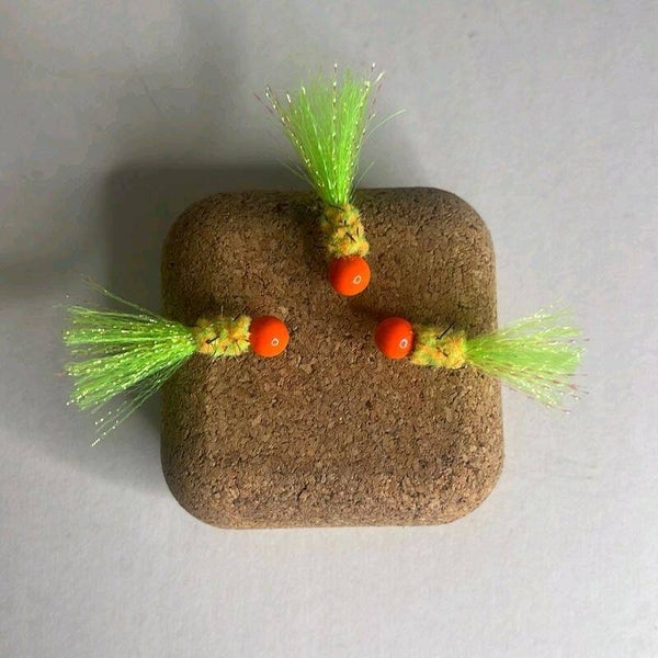 Hot Orange ball jig , fire tiger new age chenille and green chartreuse synthetic tail with orange flash .