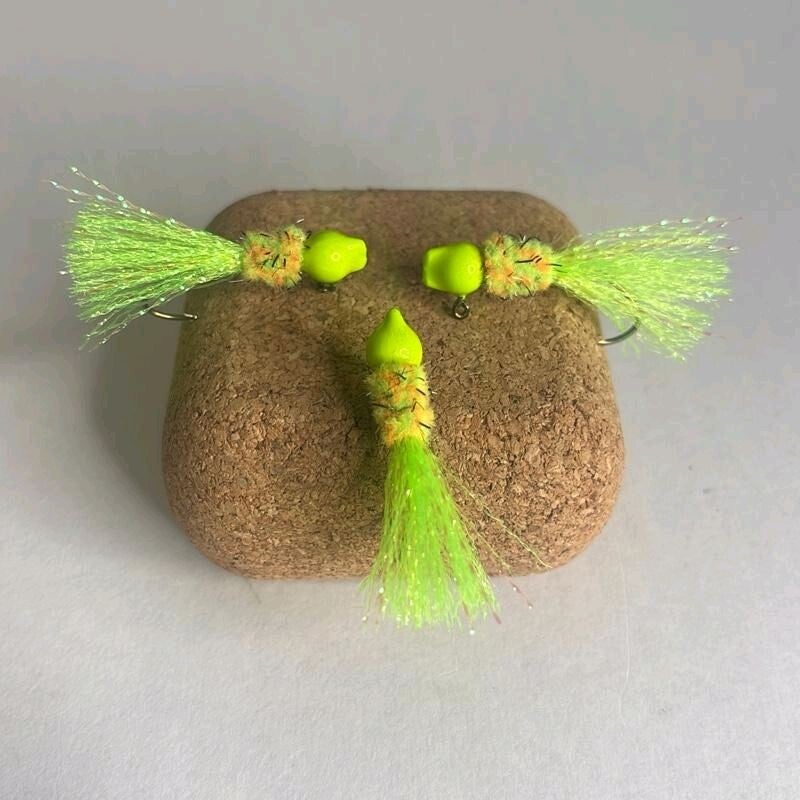 3 pack of Char Fire: This product features a unique design with a scale wedge head. It's a striking combination of green chartreuse and fire tire chenille. The synthetic tail adds an extra layer of detail with its green chartreuse color and an orange flash. Perfect for enthusiasts looking for a distinctive piece.