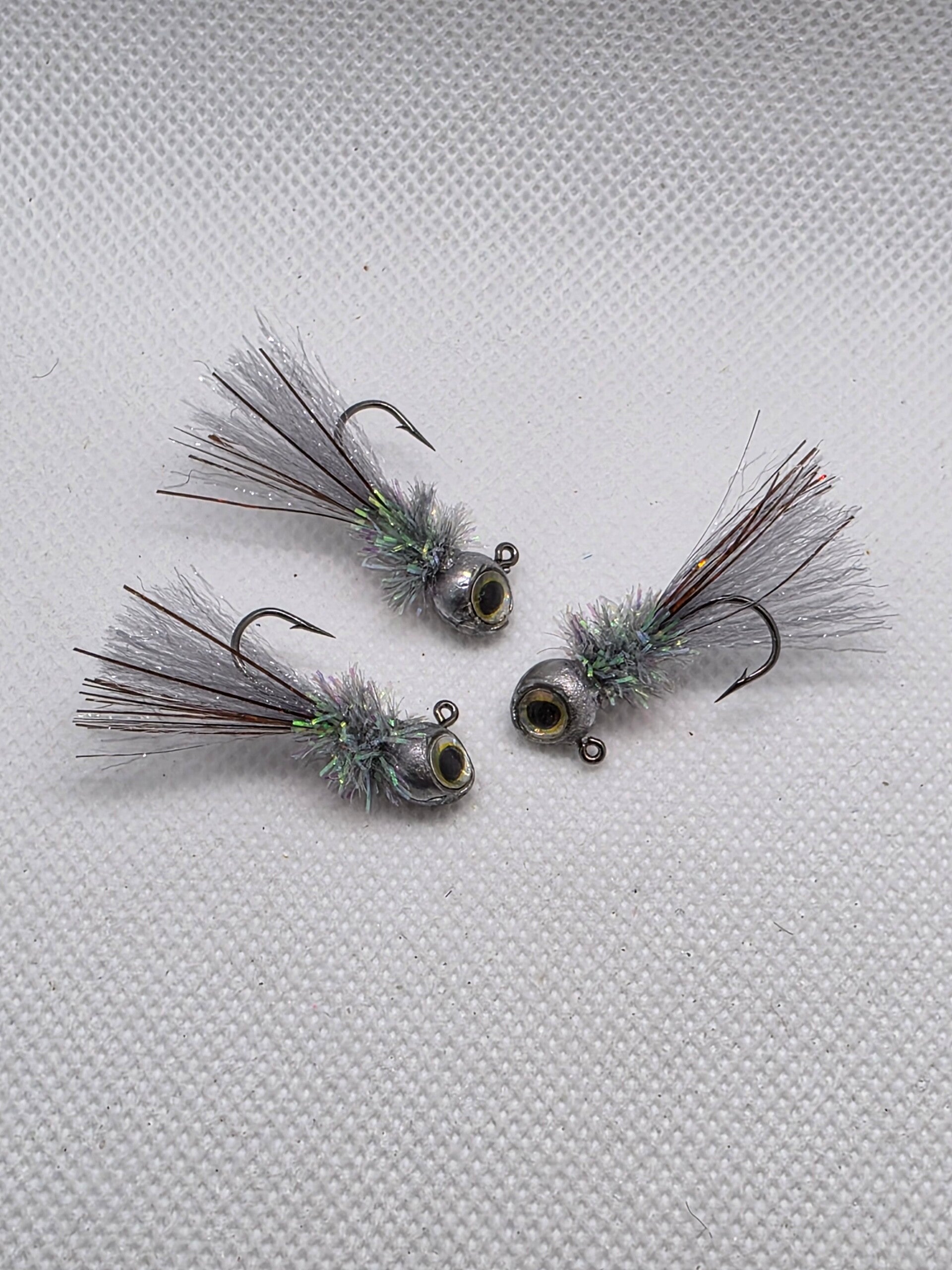 Naked (non-colored) texas minnow. With eyes . Grey ice chennile and dark Grey synthetic tail material . Infused Black/Gold flashabou.