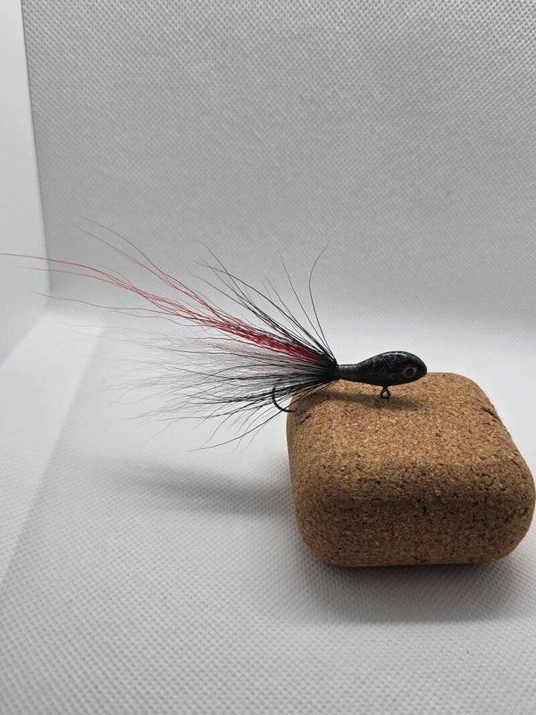 Black Crinkle ultra minnow head . Handtied white/red/black bucktail all thread is Risen for tight lock .