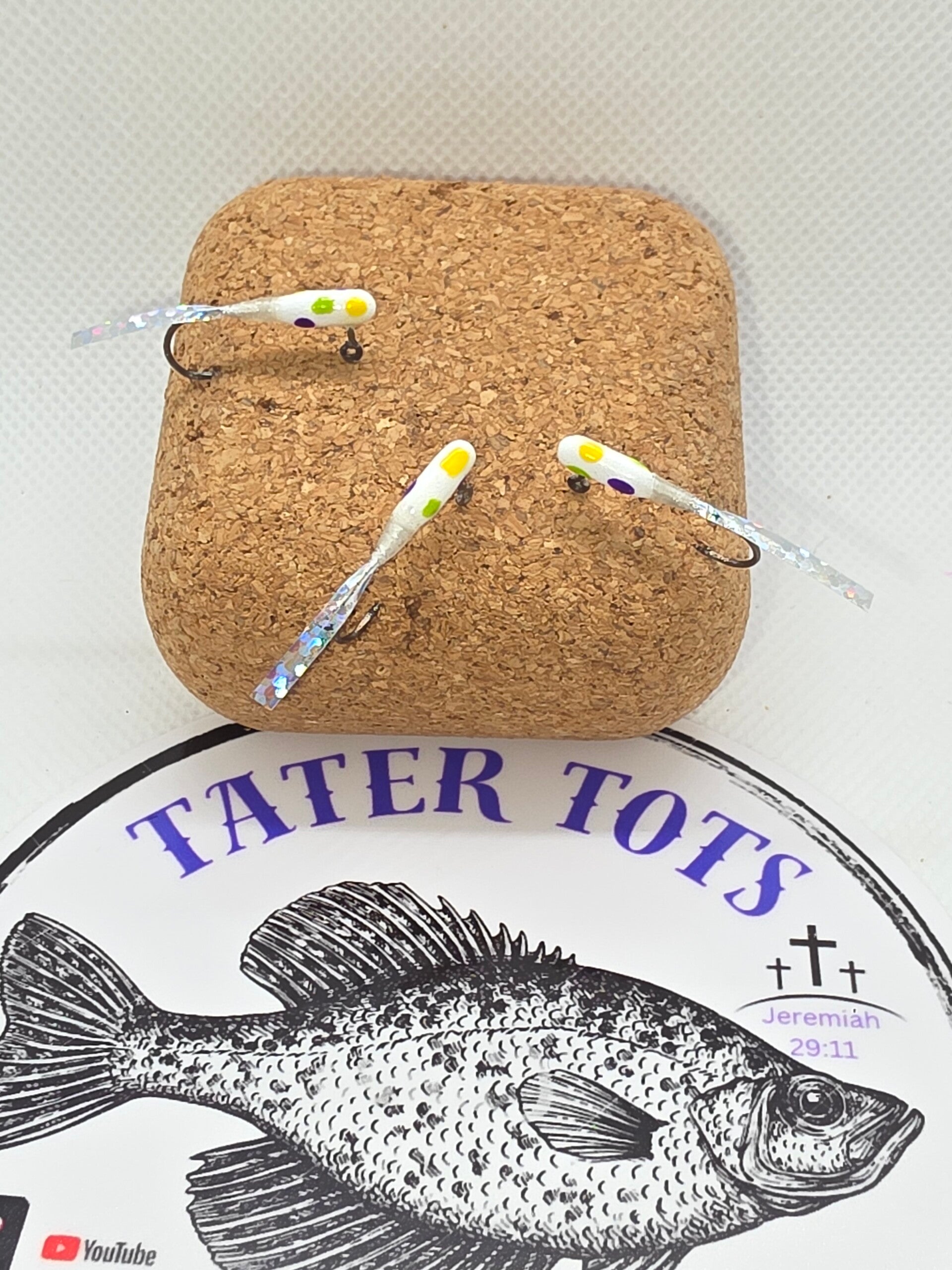 Micro White BB Jig head painted with colorful bright dots. With vintage holographic flashabo tail . Holographic Flashabo Available in 5 colors : Red Blue Green Gold and Sliver .