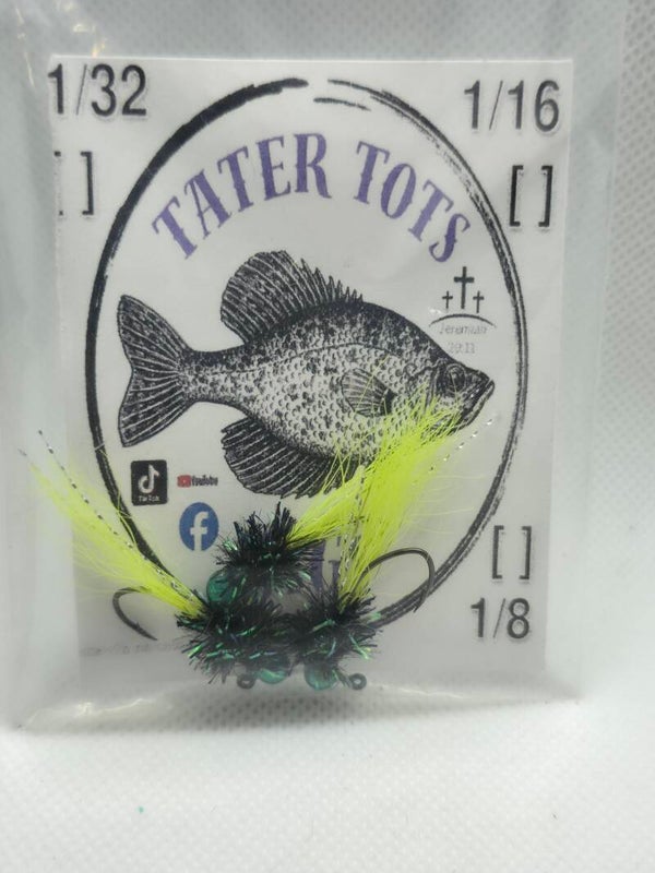 Glossy Green ball jig head .with a Black / Green flash body . Yellow buck tail with sliver flash