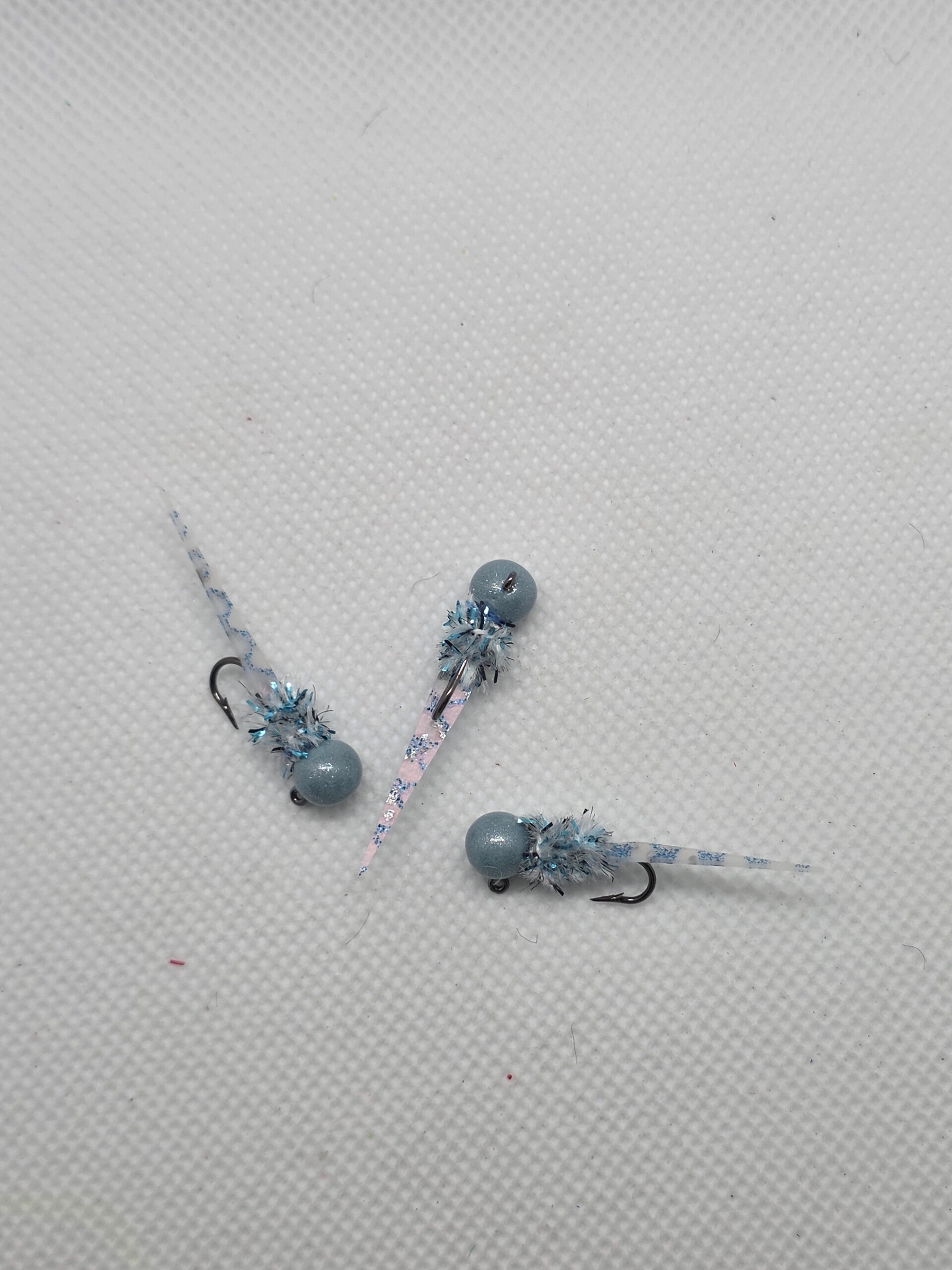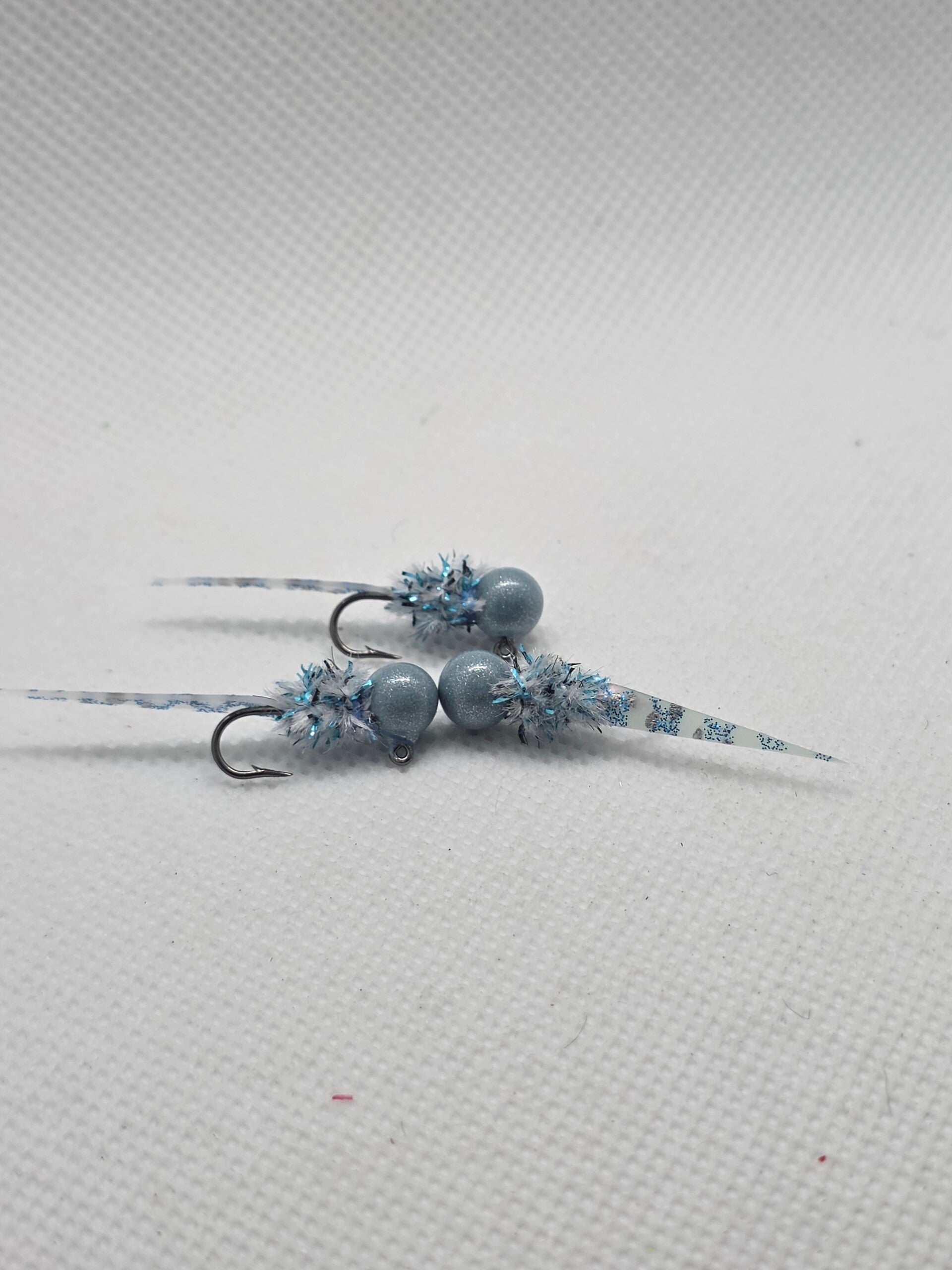 Teal sparkle jig head . Black /blue and silver ice age chenille. And monkey Milk wedge tail .