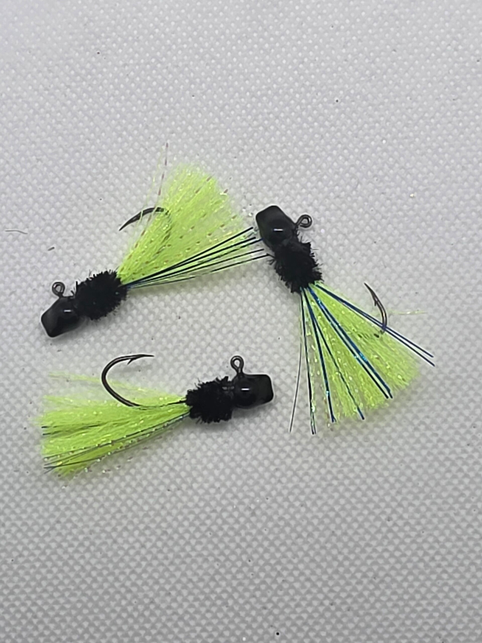 Black head with Artic Black chenille chartreuse synthetic tail peral twisted flash and Blue Ice fla